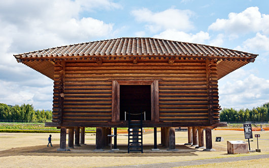 復元した「板倉」は、長さ6.9m、幅12.0mの3間×4間の建物です。茅葺(かやぶ)きの屋根、側柱に彫った溝に板を落とし込んで壁を造る「落としはめ技法」など、今日ではなかなか見かけない古代の技を感じてみてはいかがですか。
