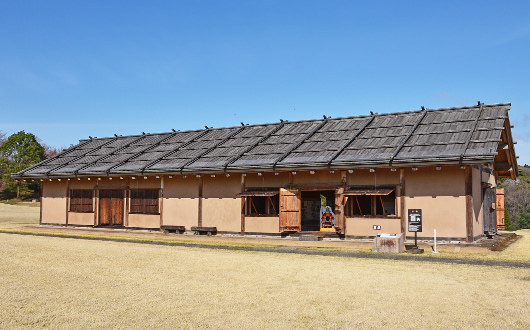 復元した「兵舎」は、長さ26.6m、幅7.8mの3間×10間の建物です。板葺(ぶ)きの屋根、土壁、土間造り、突き上げ式の窓など、防人たちの暮らしを感じてみてはいかがですか。