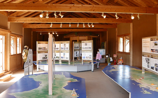 古代建築の意匠(いしょう)を採り入れたもので、復元建物ではありませんが、鞠智城と同じ時代の建築技法に触れることができます。建物内部を礎石の基礎と周りの庇(ひさし)部分を掘立柱建物(地面に直接穴を掘って柱を埋め込む)をイメージして建てられています。