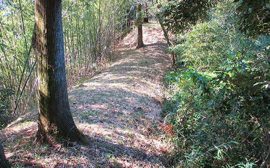 西側土塁は馬の背状の尾根が続き、その途中に灰塚、涼みヶ御所、佐官どんといった頂が連なる起伏に富んだ地形となっています。この尾根の上部に土塁が版築工法により構築されていますが、土塁の基底部までほぼ垂直に切り落とす形の構造となっています。