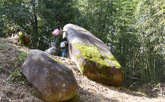 西側土塁にある自然の大きな岩です。横から見るとカエルそっくりに見えることから、ワクド石と呼ばれています。昔から地元の人の信仰の対象となっていたようです。