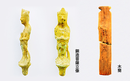 5,300㎡の広さがある池跡です。建築の木材を保管する貯木場や、水汲み場の跡(木組遺構)が見つかっています。池は標高が高いところと低いところでは9mもの高低差があり、途中に堰堤をつくって段々畑のような形状をしていたことが確認されています。池の中からは百済から持ち込まれたと考えられる銅造菩薩立像や木簡、建築部材やそれを加工する木製の農耕具などの貴重な遺物が見つかっています。