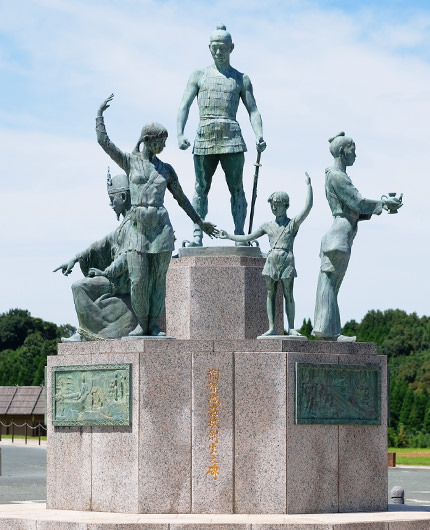 中央に防人、前面に防人の妻と子、西側に築城を指導したといわれる百済(くだら)の貴族、東側には八方ヶ岳に祈りを捧げる巫女(みこ)をイメージしたものです。北側には一対の鳳凰(ほうおう)が立っています。台座には万葉集からの防人の歌と鞠智城の歴史を解説した6枚のレリーフが掲げられています。