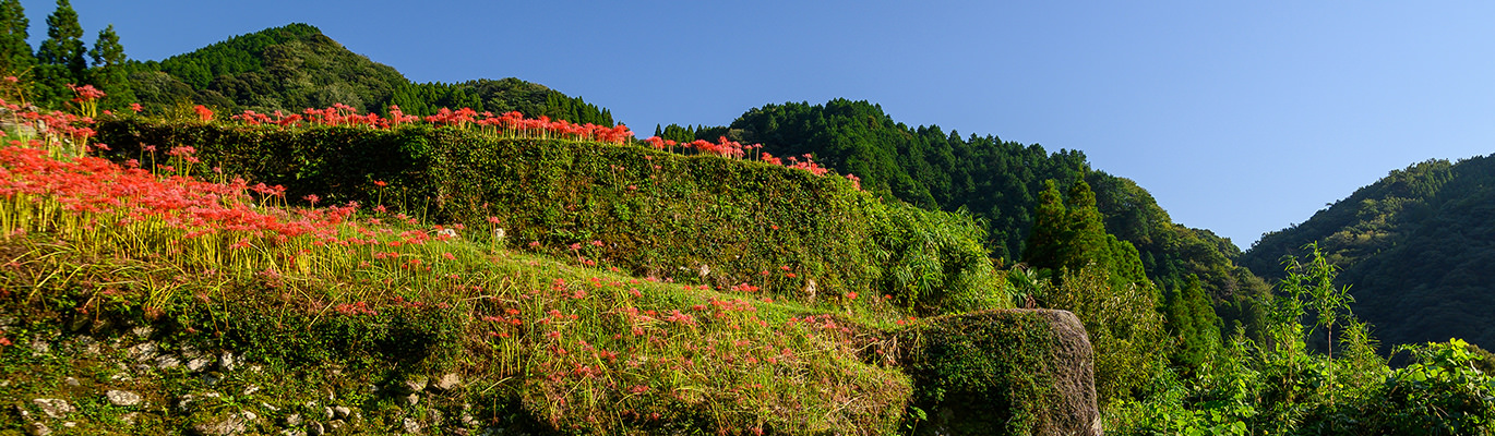 急傾斜にある杓200枚の石積の棚田。9月半ばには、黄金色の稲穂と真っ赤な色の彼岸花が、石垣とマッチして素晴らしい景観。「日本棚田百選」の一つ。